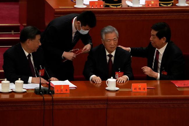 Chinas President Xi Jinping right watches as former president Hu Jintao Centre touches the shoulder of Premier Li Keqiang 2nd left as he leaves the closing ceremony of the. So when former Chinese President Hu Jintao was guided off. 1 hour agoThe twice-a-decade congress of China s ruling Communist Party is a tightly choreographed event.